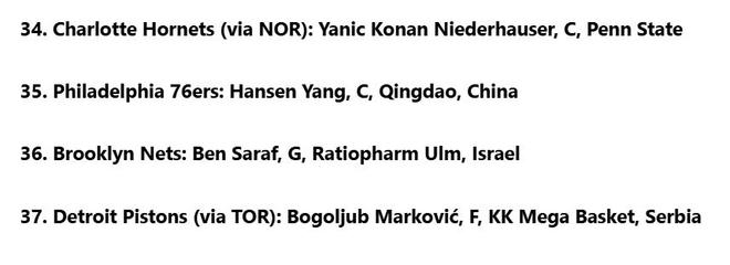 雷速體育6月17日訊 美媒NBC更新2025年NBA模擬選秀最新一期排名,中國(guó)球員楊瀚森第35順位被76人隊(duì)選中。